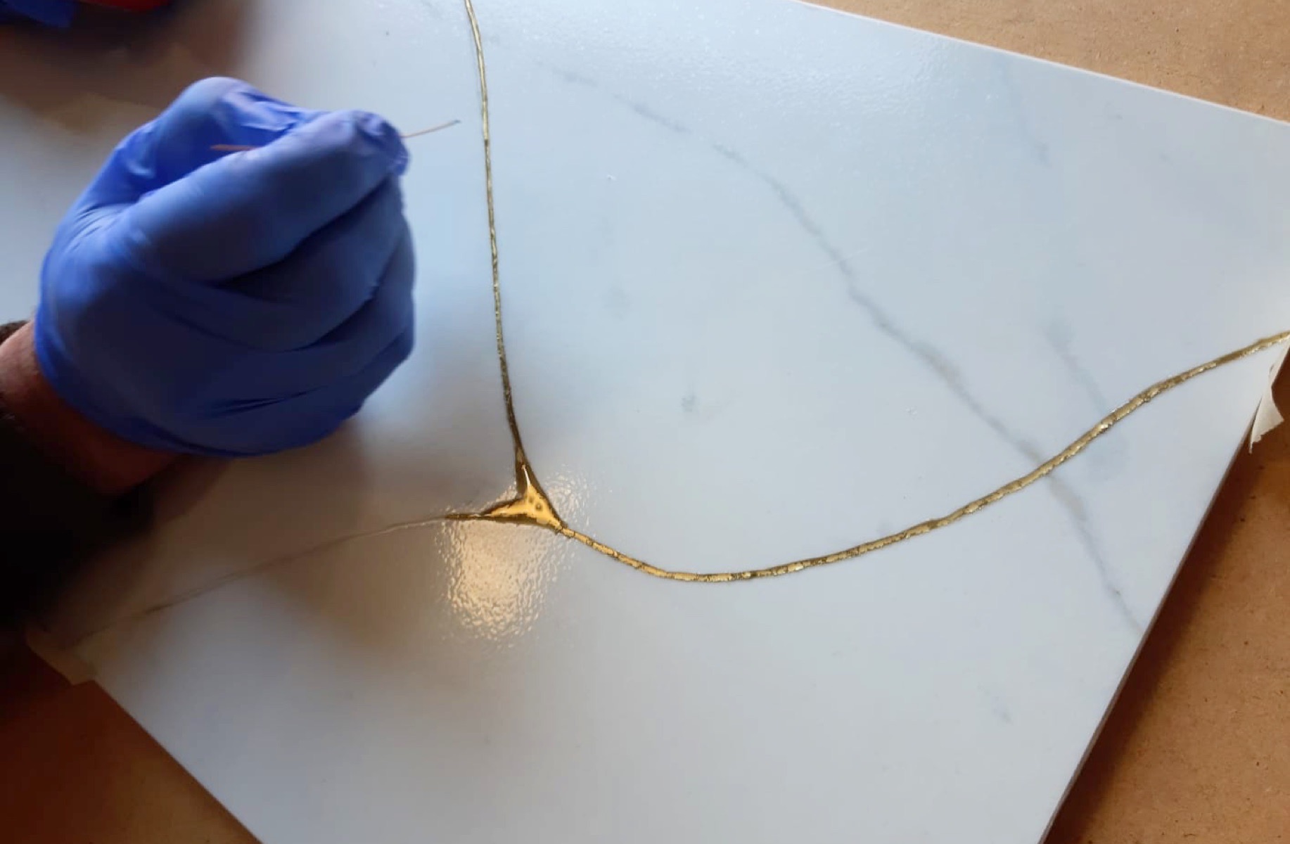 Cuando le devolvieron el artefacto, notó que había sido reparado con unos ganchos de metal extremadamente antiestéticos. Intentó una vez más, esta vez con artesanos de su propia tierra. Los trabajadores decidieron entonces convertir este objeto en una joya: rellenaron las grietas con resina lacada y oro en polvo.